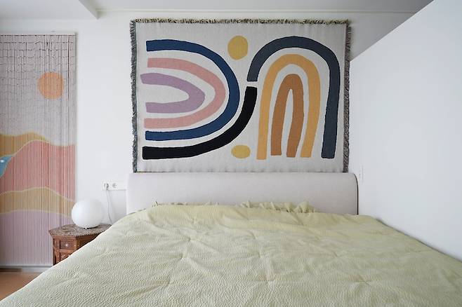 침대 옆에는 서재 방 베란다와 연결되는 방화문이 있는데요. 직구로 사입한 커튼 발로 살짝 가려두었어요. 원래는 세탁실에 달으려고 샀었는데 자주 왔다갔다 하는 곳에 두면 좀 걸리적 거릴 것 같아 고민하고 있었는데 딱 알맞은 장소를 찾았네요!