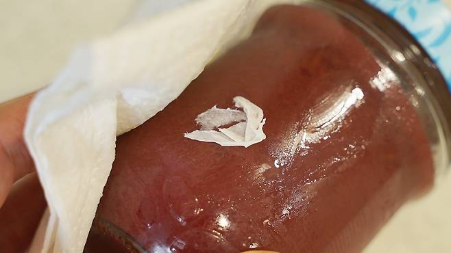 이렇게 끈적이나 자국이 남아 있으면 손톱으로 아주 열심히 긁어야 겨우 제거할 수 있는데요. 이제는 식용유 하나를 준비하세요.