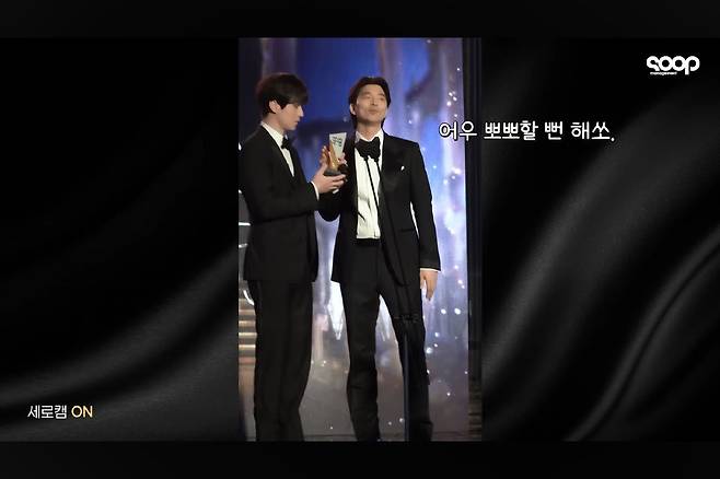 이날 영상에서 공유는 드라마 '도깨비'로 인연을 맺은 절친한 배우 이동욱과 함께 시상식을 연상케 하는 세트장에서 멋진 턱시도를 입고 나란히 등장했다.