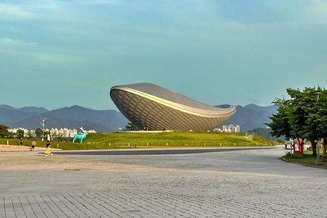 강정보 디아크는 대구에서도 손꼽히는 노을 명소다. 해가 서쪽으로 기울면 금계국 위로 붉게 물든 하늘과 낙동강 수면이 서로를 비추며 극적인 풍경을 완성한다. 금빛으로 번지는 석양 속 디아크의 실루엣은 자연과 건축의 조화를 가장 인상 깊게 보여주는 순간이다.