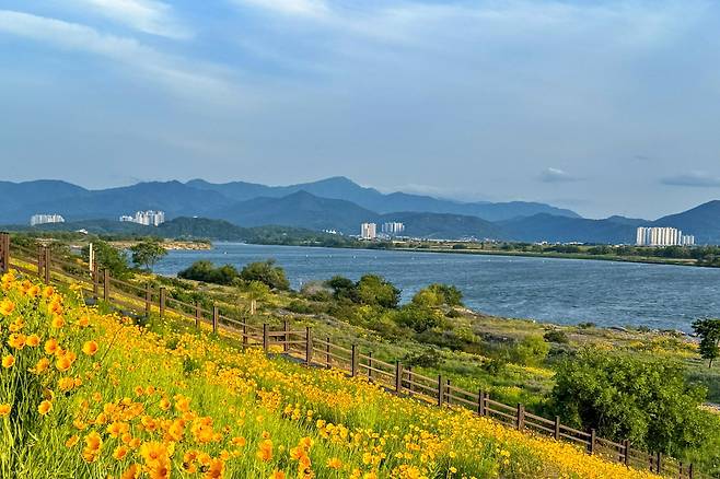 푸른 하늘과 싱그러운 바람이 어우러지는 5월, 대구 달성군 강정보 디아크 광장이 노란 금계국으로 물들었다. 낙동강을 따라 이어진 산책로와 디아크 전시관 뒤편 언덕길에는 금계국이 흐드러지게 피어나 산책과 사진 촬영에 안성맞춤이다.