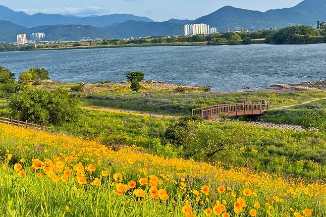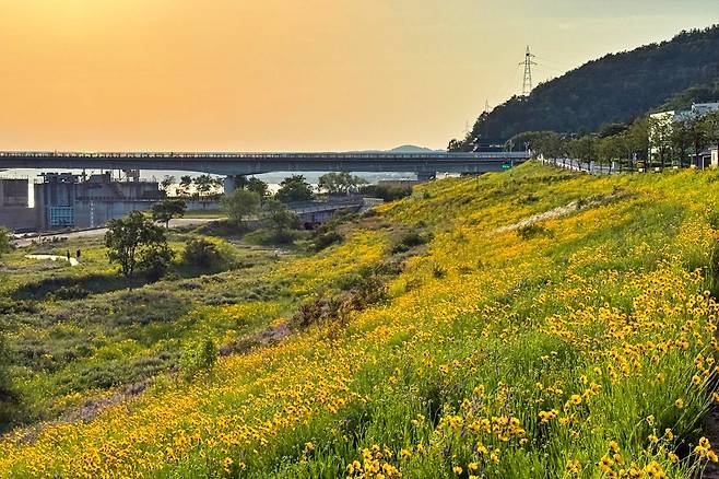 디아크 광장은 계절마다 다른 매력을 선보이지만, 금계국이 활짝 핀 5월 말은 특히 빛나는 시기다. 바람 부는 날, 햇살 좋은 오후, 낙동강의 풍경과 황금빛 꽃밭이 어우러진 강정보 디아크 광장에서 자연의 여유를 만끽해보자.