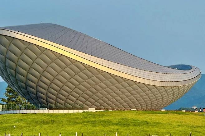 강정보 디아크는 대구에서도 손꼽히는 노을 명소다. 해가 서쪽으로 기울면 금계국 위로 붉게 물든 하늘과 낙동강 수면이 서로를 비추며 극적인 풍경을 완성한다. 금빛으로 번지는 석양 속 디아크의 실루엣은 자연과 건축의 조화를 가장 인상 깊게 보여주는 순간이다.
