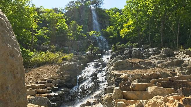 그러나 '인공'이라는 말이 무색할 만큼 이질감은 전혀 없다. 원래 있던 기암괴석 사이를 그대로 살리고, 도솔제 저수지에서 흘러오는 물을 활용해 사계절 내내 흐르는 장대한 폭포를 구현해낸 것. 사람의 기술로 완성했지만, 그 존재감은 자연을 능가할 만큼 장엄하다.