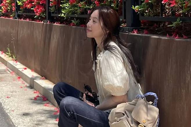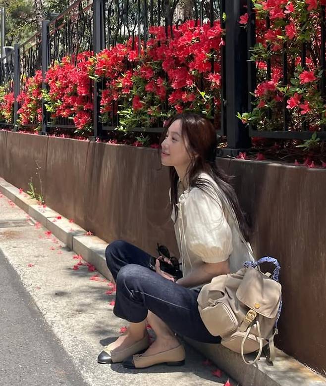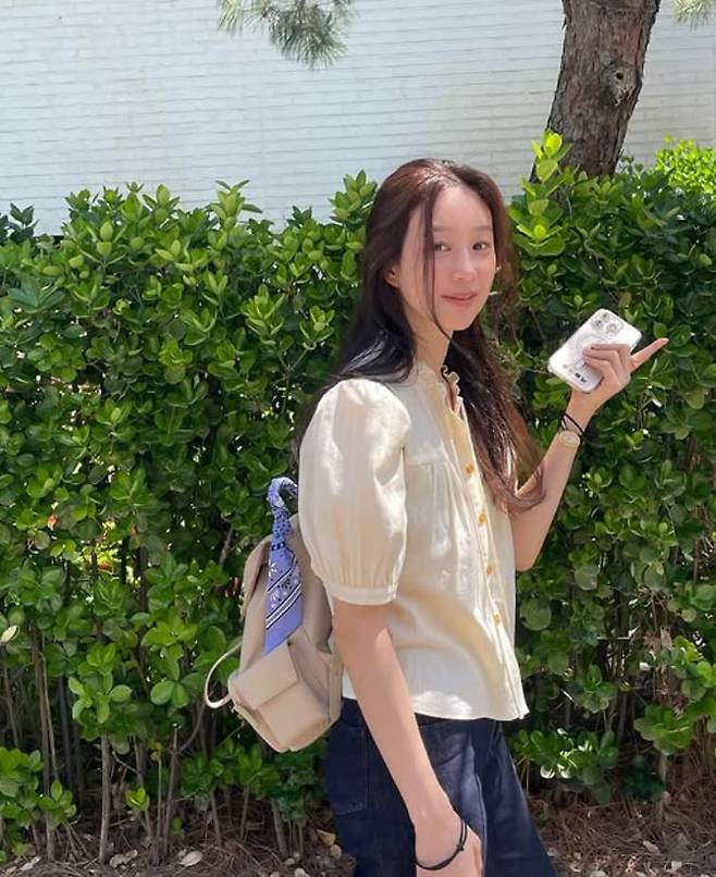 정려원은 크림톤의 퍼프소매 블라우스로 러블리하면서도 청순한 초여름 룩을 완성했는데요. 가벼운 소재의 블라우스는 은은하게 비치는 햇빛과 잘 어우러져 청량한 분위기를 강조하기 좋은 아이템입니다. 여기에 데님 팬츠와 베이지색 가방, 귀여운 패턴의 스카프를 매치해 생기 있는 스타일링을 보여줬습니다.