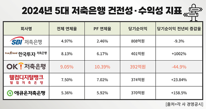 부동산 PF 대출 부실은 대손충당금 적립금 상승, 수익성 악화 등 도미노 효과를 낳고 있다. 지난해 OK저축은행의 당기순이익은 392억원으로 전년 대비 44.9% 감소했다. 같은 기간 한국투자저축은행은 401억원의 당기순이익을 내면서 OK저축은행을 누르고 순이익 업계 2위에 올라 섰다.