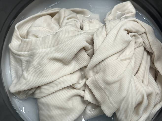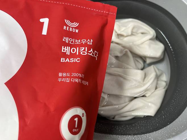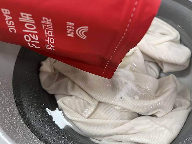 따뜻한 물에 옷을 넣고 베이킹소다를 뿌립니다. 물 1L 당 베이킹소다 3큰술 비율로 넣으세요.