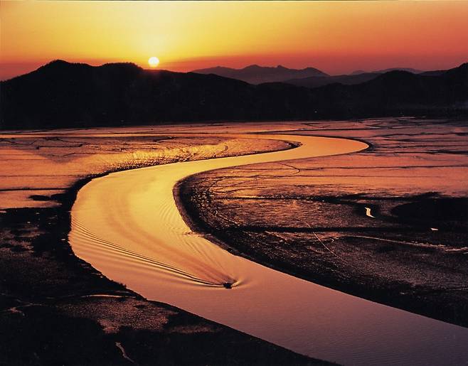 순천만 습지 위를 흐르는 수로가 S자 곡선을 그리며 이어지는 풍경은 해 질 무렵 가장 극적인 장면을 만들어낸다.