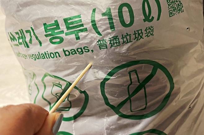 그렇다고 무조건 꽉꽉 눌러버리면 자칫 쓰레기봉투가 찢어질 수 있는데요. 이럴 때 이쑤시개 하나면 꽉 찬 쓰레기봉투 입구를 아주 쉽게 묶을 수 있으면서 쓰레기봉투도 절약할 수 있답니다.