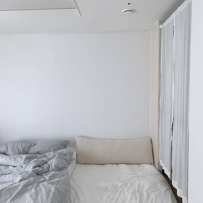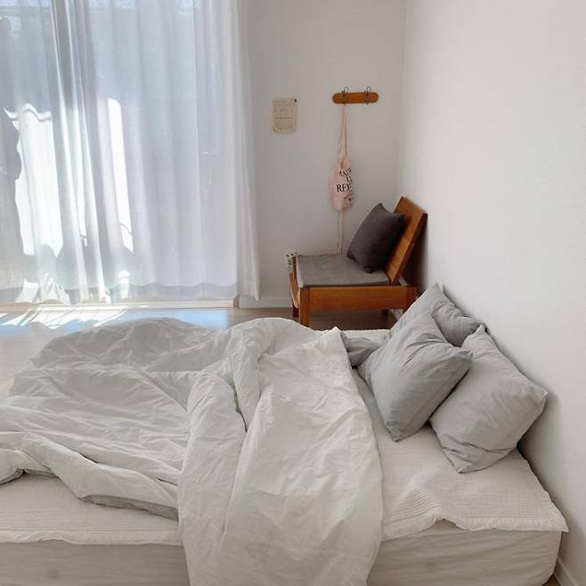 대신 밤에 잘 때는 폭신한 퀸 사이즈 요패드를 깔고 잔답니다.매일 아침 이부자리를 정리하는 일이 번거롭긴 하지만 안방을 청결하고 넓게 사용할 수 있어서 좋아요.