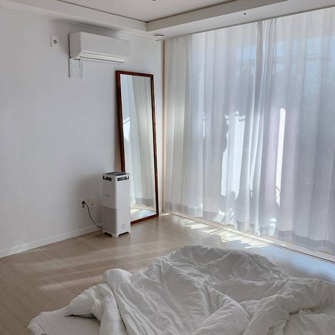 안방 커튼은 암막은 아니지만 널어놓은 빨래가 지저분하게 보이지 않도록 도톰한 린넨을 사용했어요.커튼을 통해 새어 들어오는 빛이 한결 따뜻한 분위기를 만들어줘요.4-5년 전부터 꾸준히 사용하고 있는 발뮤다 공기청정기에요.디자인이 심플하고 기능이 단순해서 어느 공간에나 어울리는 취향 저격 가전이에요.