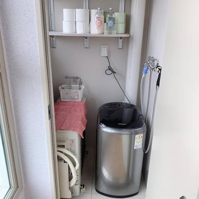안방 베란다의 실외기실에 이렇게 아기 세탁기 하나가 딱 들어갈 공간이 나와서아기 빨래는 메인 세탁실과는 별도로 안방 베란다에서 세탁, 건조까지 한 번에 할 수 있어 좋아요.이제 주부 7년 차가 되다 보니 예쁜 집도 중요하지만살림 동선이 길지 않고 되도록 한 가지 일은 한자리에서 끝낼 수 있는 게 아주 중요하더라고요.