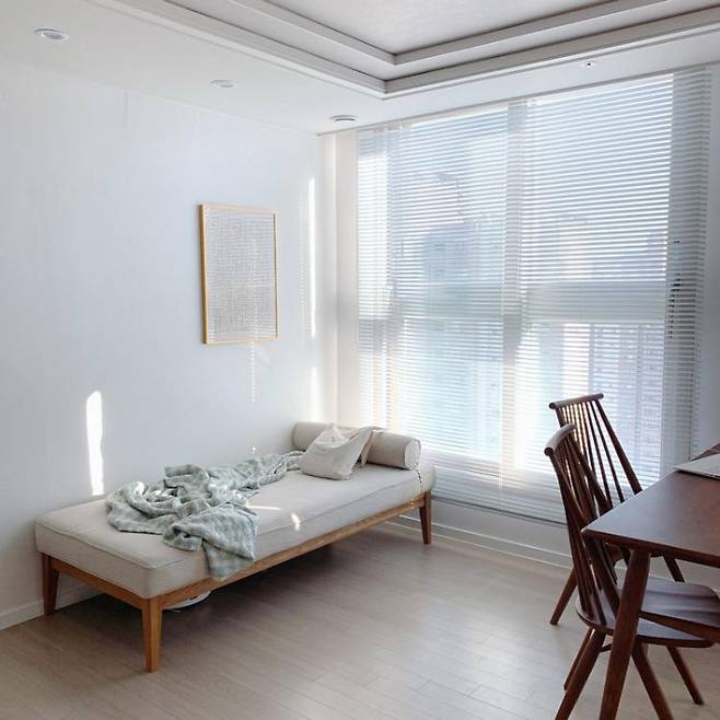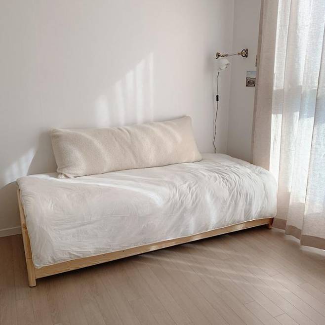 소파가 없는 대신 거실 한구석에 데이베드 자리를 마련했어요. 아기가 낮잠 자는 시간에 누워서 폰을 만지면서 휴식할 수 있는 자리인데, 블라인드 사이로 오후 햇살이 깊게 들어와 사진보다 실제로 더 예쁜 공간이에요.