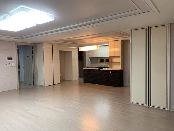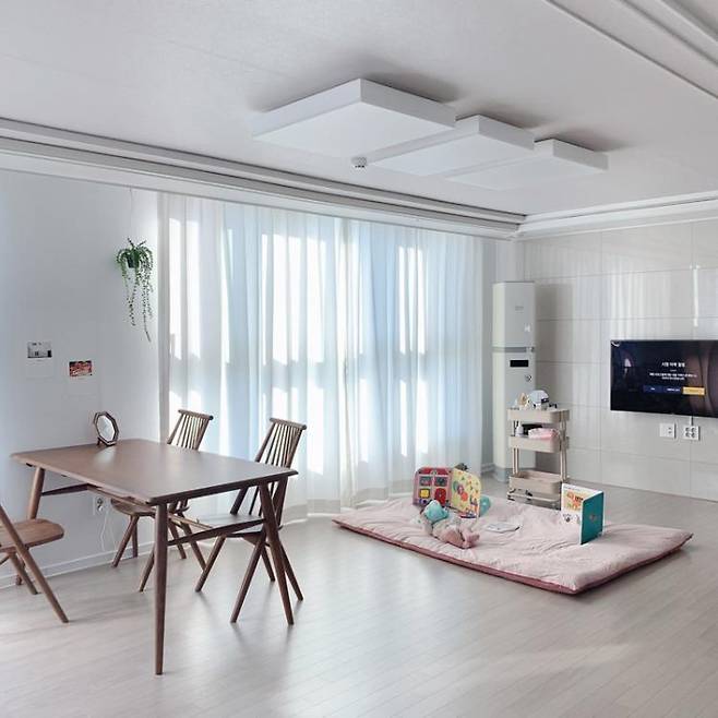 평수에 비해 거실이 아주 넓게 나온 집인데 소파 자리에는 임시로 4인용 식탁이 놓여있어요.