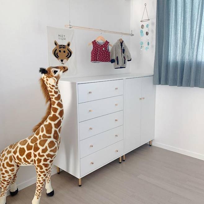 맞은편은 아기 옷장인데, 기존 집에서 사용하던걸 가져왔지만 새로 맞춘 붙박이장과 분위기가 비슷해 전체적으로 깔끔한 드레스룸이 완성되었어요.