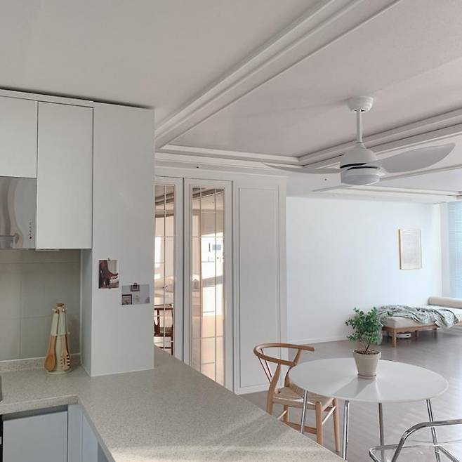 주방의 실링팬 조명은 20평대 아파트에서 사용하던 에어컨이주방까지 시원하게 해줄 수 없을 것 같다는 생각에 공기 순환을 돕고자 설치했어요.막상 설치해 보니 공간과도 잘 어울리고 소리 없이 강하게 돌아가 환기에도 좋아요.