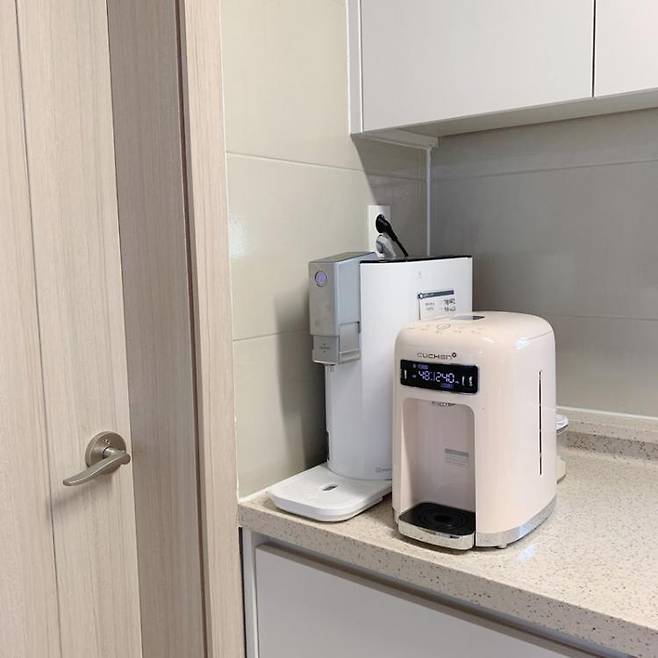 정수기와 분유 포트 바로 옆이 다용도실 문이라 문을 열고 팔만 뻗으면 쉽게 젖병을 꺼낼 수 있어서오히려 다른 곳에 올려두고 사용하는 것보다 더 편한 것 같아요.분유 포트는 지금까지 사용해 본 모든 육아 용품 중 저희 부부가 베스트로 꼽는 제품이에요.버튼 하나로 가열, 살균, 보온이 가능해 물을 끓이고, 식히고, 온도까지 맞춰주어분유를 타는 모든 과정을 생략할 수 있어요.디자인도 너무 예뻐서 싱크대 위에 올려두고 사용하기도 좋아요.