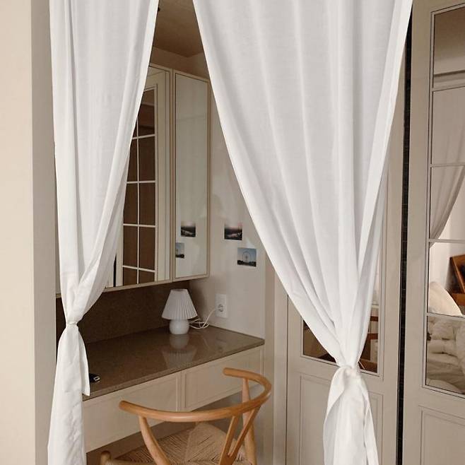 화장대와 화장실, 드레스룸이 있는 공간과 잠자는 공간을 분리하기 위해모달 소재의 가림 커튼을 제작했어요.안방은 기존 입주 상태 그대로 사용하는 건데화이트 커튼 하나로 분위기가 많이 달라져서 너무 마음에 들어요.