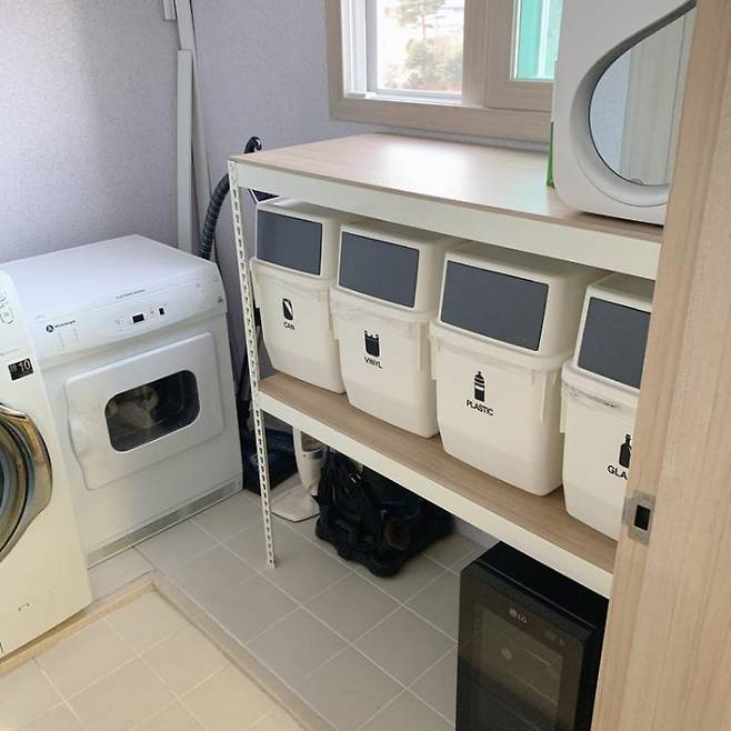 싱크대 옆 작은 다용도실이에요. 세탁기, 건조기, 청소기와 함께 주방에 두기엔 예쁘지 않은 젖병소독기와 와인셀러도 있어요.