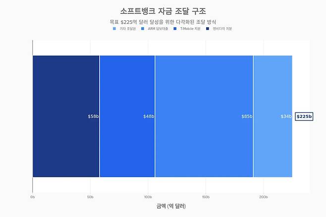 <소프트뱅크의 오픈AI 투자를 위한 225억 달러 자금 조달 구조를 보여주는 차트. 엔비디아와 T-Mobile 지분 매각, ARM 담보 대출 등을 통해 자금을 확보했다.>