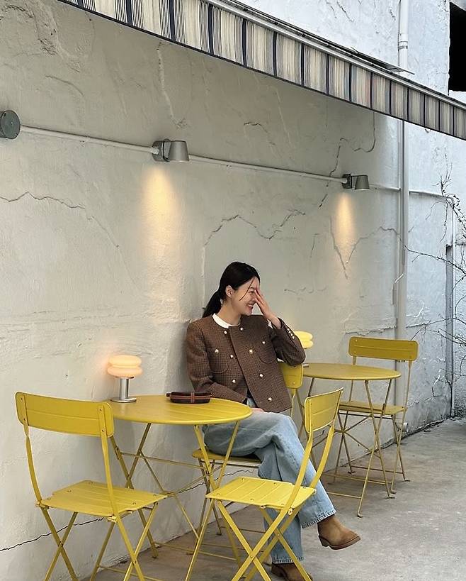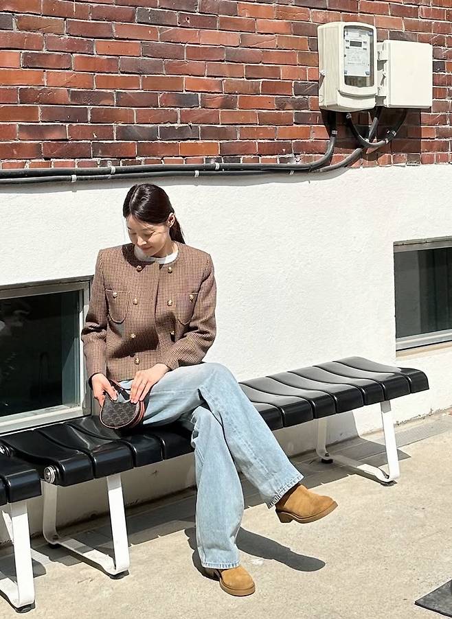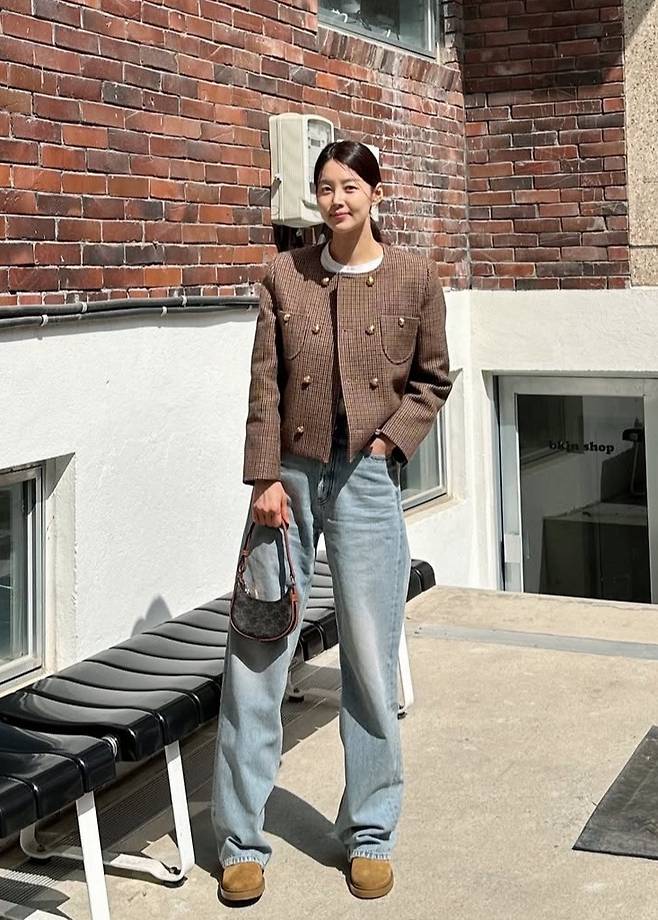 클래식한 체크 패턴의 브라운 더블 버튼 재킷을 활용해 단정하면서도 세련된 무드를 연출했습니다.