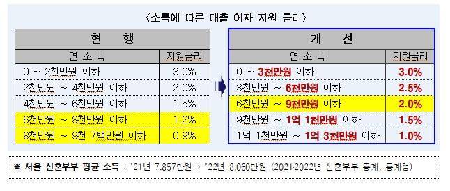 서울 신혼부부 평균 소득구간(2022년 연소득 8천60만원)에 해당하는 신혼부부는 2.0%의 이자 지원 금리 혜택을 받을 수 있게 된다. 기존에는 0.9% 내지 1.2%의 지원 금리가 적용됐다.