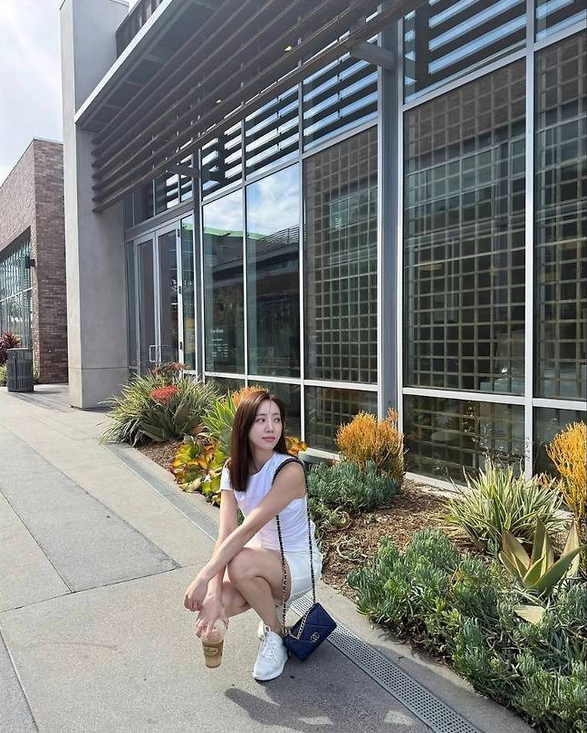 여기에 화이트 스니커즈로 편안함을 더하면서도 스포티한 무드를 살렸고, 네이비 체인백을 매치해 포인트를 줬습니다.