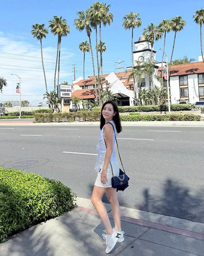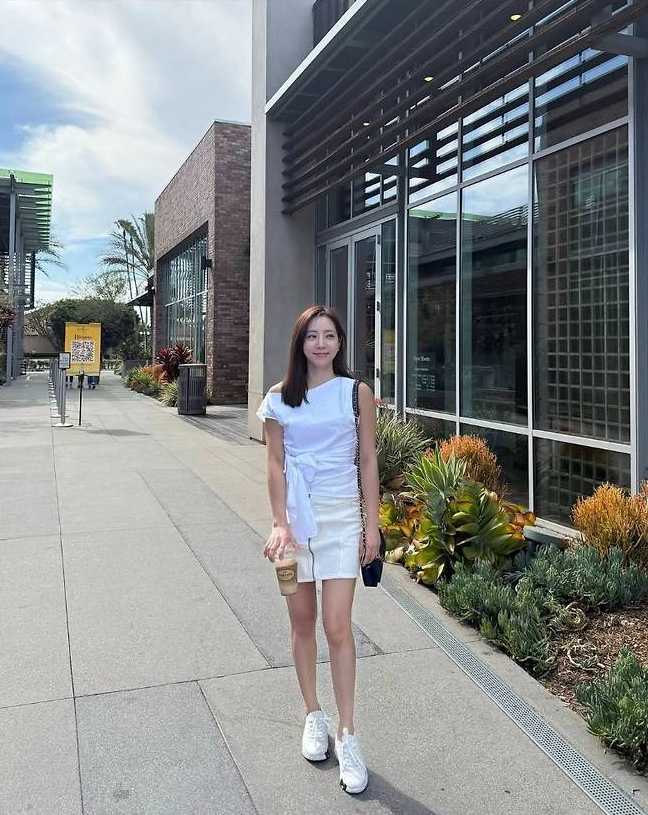 정순주는 슬리브리스 화이트 톱에 미니 스커트를 매치해 통통 튀는 서머룩을 완성했습니다.