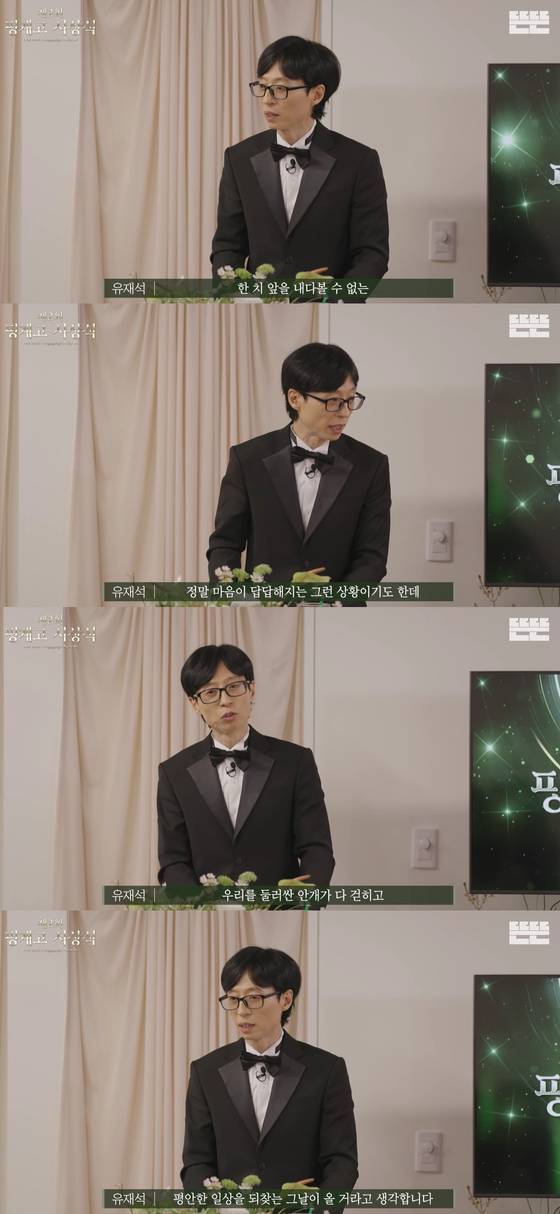 유재석은 "여러분도 아시겠지만 지금 현 상황이 한 치 앞도 내다볼 수 없는 답답한 상황"이라며 "새해가 얼마 남지 않았는데, 우리를 둘러싼 안개가 걷히고 평안한 일상을 되찾는 날이 올 것이라 믿는다"고 말했다.