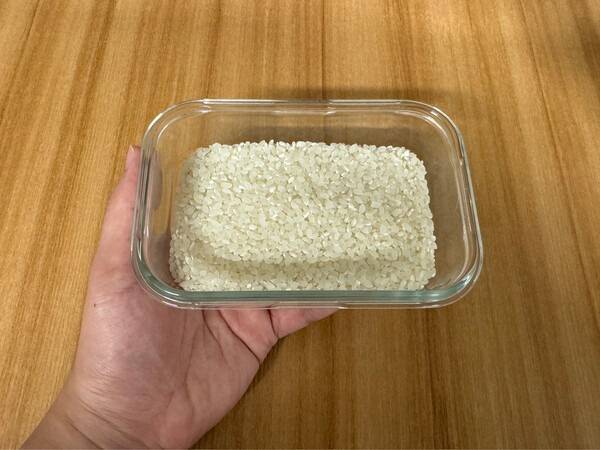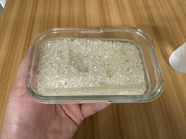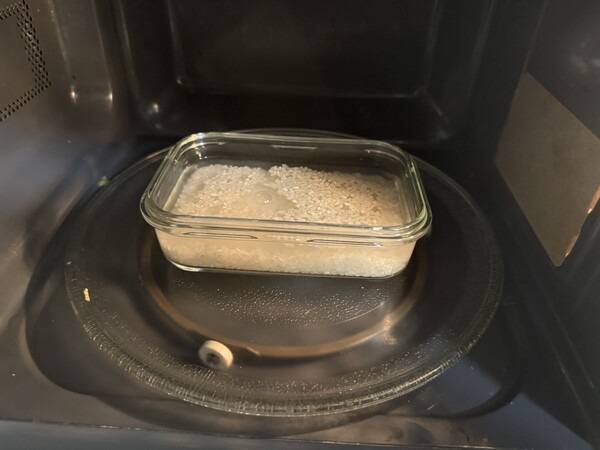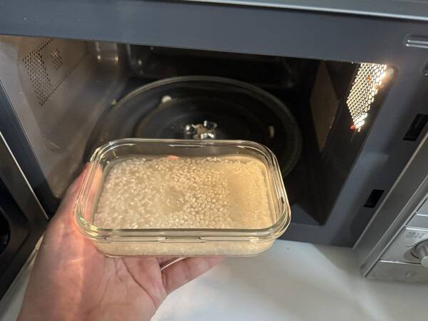 방법은 이렇습니다. 깨끗이 씻은 쌀을 전자레인지용 용기에 담고, 50~60도 정도로 데운 물을 쌀 양의 약 1.2~1.5배 정도 붓습니다.