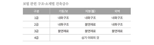 한편, 목조주택의 경우 가입 시 내·외관 사진을 제출해야 하는 보험사가 있고, 철근콘크리트 주택보다 기본적으로 보험료가 높게 산정된다. 목조주택은 내화성능이 좋고, 화재 발생 시 유독가스 발생이 적어 인명 피해가 적은 편이지만 주택화재보험에서는 주택이 전부 타는지가 더 중요한 요인으로 작용되기 때문에 불리하다. 보험료를 산정할 때 건물 구조에 따라 구분되는 ‘건축 급수’를 적용하는데, 급수가 높아질수록 화재 위험도가 높다. 1급은 일반적으로 철근콘크리트, 2급은 벽돌집, 3급은 조립식, 4급이 목조주택이다.