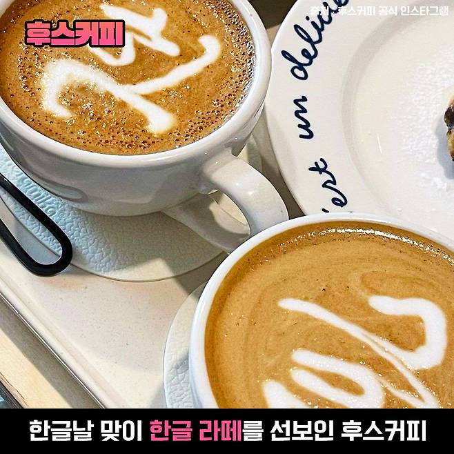 한글날을 맞이해 한글 라떼 선보인 후스커피에요. 최근에 서울에서 열린 라떼 경연 대회에서 우승할 만큼 실력자 사장님이 이곳을 운영 중이라고 하네요.