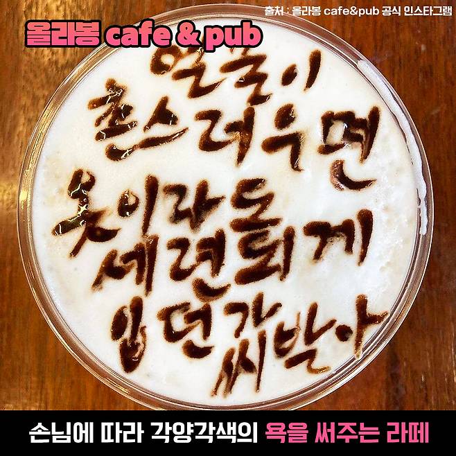 라떼 위에 욕을 써주는 라떼로 유명한 울라봉 카페에요. 라떼 거품 위에 손님의 이야기를 사장님이 정성껏 적어주는 라떼아트가 시그니처인데요.