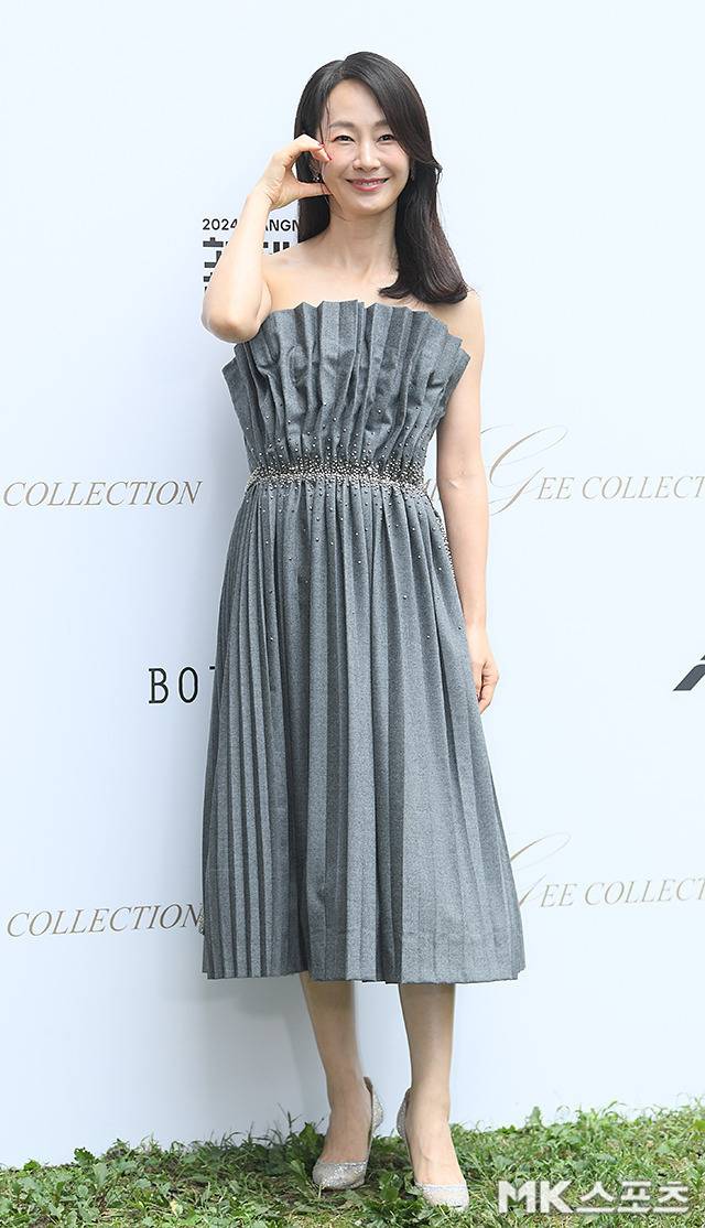 명세빈은 독특한 플리츠 디테일이 돋보이는 스트랩리스 그레이 드레스로 우아하면서도 세련된 분위기를 연출했습니다.