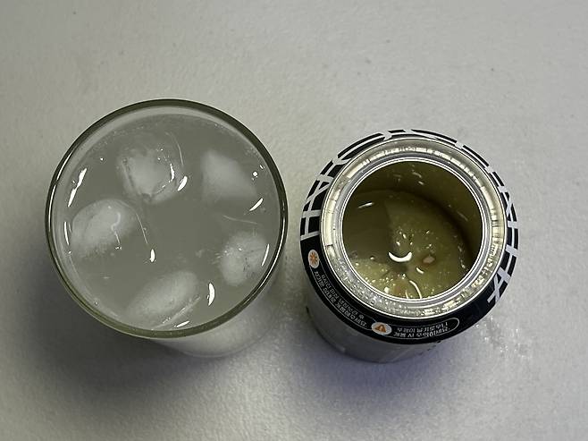 얼음 잔에 따르고 나서 한 모금 마셔보니 레몬맛과 포도맛이 섞이는데 둘 다 애매한 맛이나요.