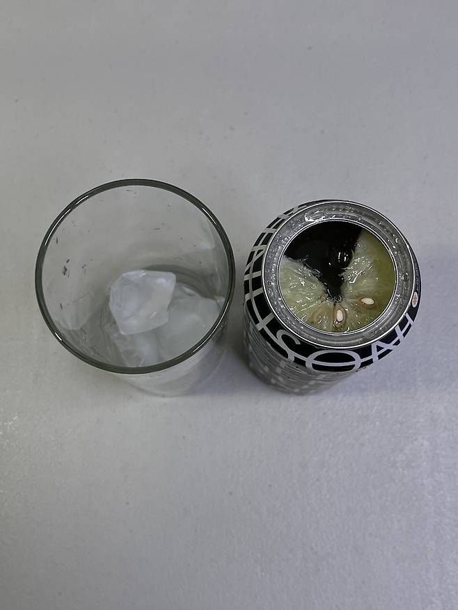 뚜껑을 열어보니 레몬조각이 1개 들어있어요.
