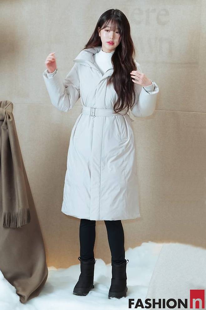 이날 장원영은 코트 같은 드레스업 화이트 롱패딩룩으로 겨울 여친룩을 연출했다.