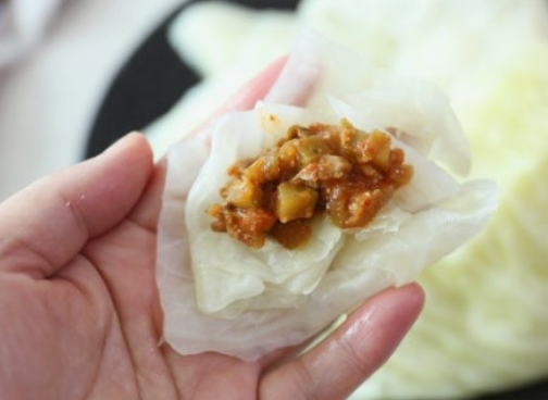 물이 보글보글 끓기 시작한 후 7분 정도 쪄주면 부드럽고 촉촉한 양배추찜이 완성됩니다.
