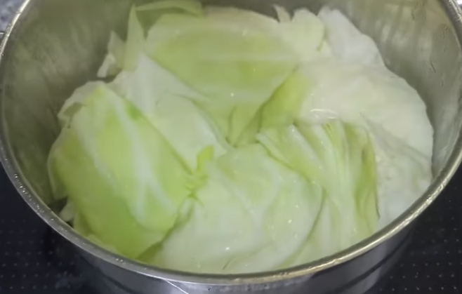 냄비를 준비해, 움푹한 모양에 양배추가 단면을 바닥에 향하도록 배열합니다.