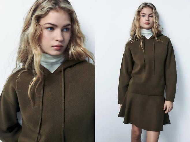 넥 라인이 불편하지 않고 귀여운 후드티를 찾고 있다면 ‘단색 니트 스웨트셔츠’를 추천한다. 나는 후드가 달린 옷의 매력을 알고 있지만, 답답한 넥 라인 때문에 주로 후드집업을 입는 편이다. 하지만 이 제품은 조금 다르다. 부드러운 소재와 여유로운 핏으로 하루 종일 착용해도 부담이 없다. 세로로 줄무늬 골이 있어 부피감이 있고 신축성도 좋아 따뜻함과 안정적인 착용감을 준다. 후드가 너무 무겁지 않고 폭이 넓고 깊어 후드 착용 여부와 관계없이 편안하고 완성도 높은 핏을 느낄 수 있다.