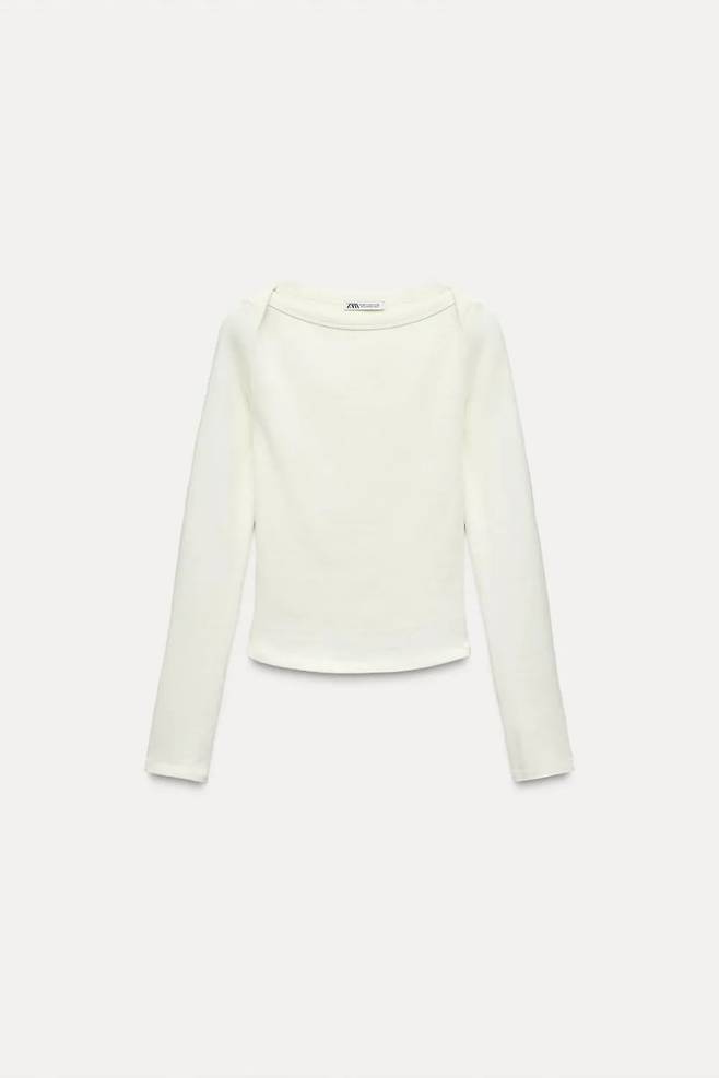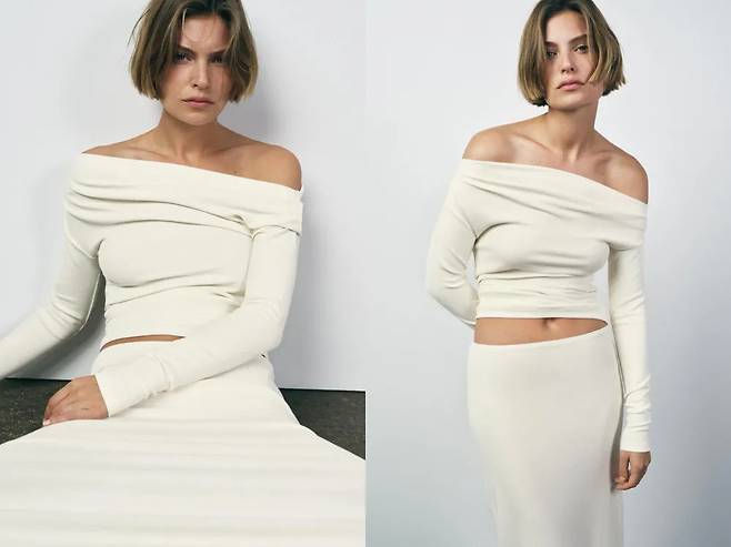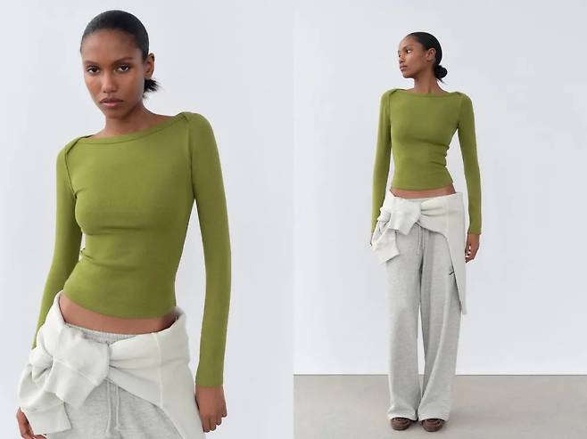 베이직한 티셔츠로 포인트를 주고 싶다면 ‘리브드 보트넥 티셔츠’를 추천한다. 입는 순간 “혹시 제니 아니세요?”라는 말이 나올 만큼 예쁜 어깨라인을 만들어주는 이 티셔츠는 매력적인 기본템이다. 보트넥 디자인은 목선과 쇄골라인을 자연스럽게 드러내어 페미닌한 분위기를 극대화한다. 여기에 몸매를 부드럽게 감싸면서 깔끔하고 우아한 실루엣을 연출해 사계절 내내 활용도가 높은 아이템.