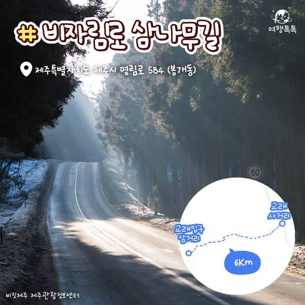 교래 입구 삼거리에서 사려니 숲 입구를 지나 구좌읍 평대 초등학교까지 길게 이어지는 비자림로는 전체가 드라이브 코스이지만 교래 입구 삼거리에서 사려니 숲 북쪽 출입구(비자림로 출입구)를 지나는 구간까지 삼나무 숲 길은 특히 인기가 높다고 합니다. 사진가들의 단골 촬영지로 유명하다고 하네요.