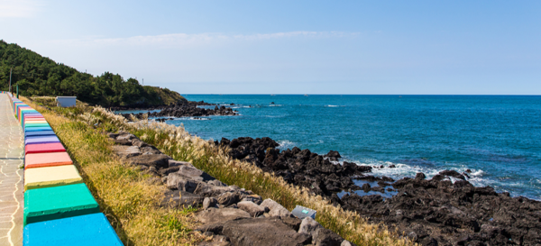 도두동 무지개 해안도로는 바로 이 용담이호해안도로를 타고 달리다 보면 만날 수 있는데요. 용두암부터 도두봉까지 쭉 달려서 해안도로를 배경으로 빨주노초파남보 무지개색으로 칠해진 방호벽을 볼 수 있습니다.