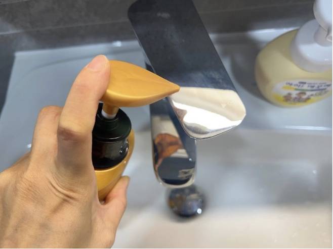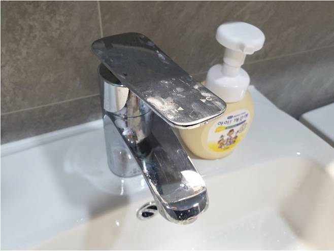 손 씻을 때, 세수할 때, 양치할 때 튄 물 때문에 얼룩이 가장 많이 생기는 곳이 세면대 수전이에요.