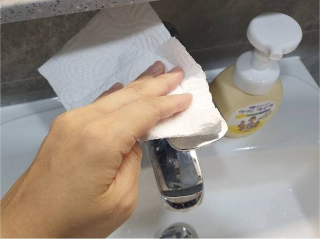 물기가 없는 상태에서 수전을 골고루 닦아주세요