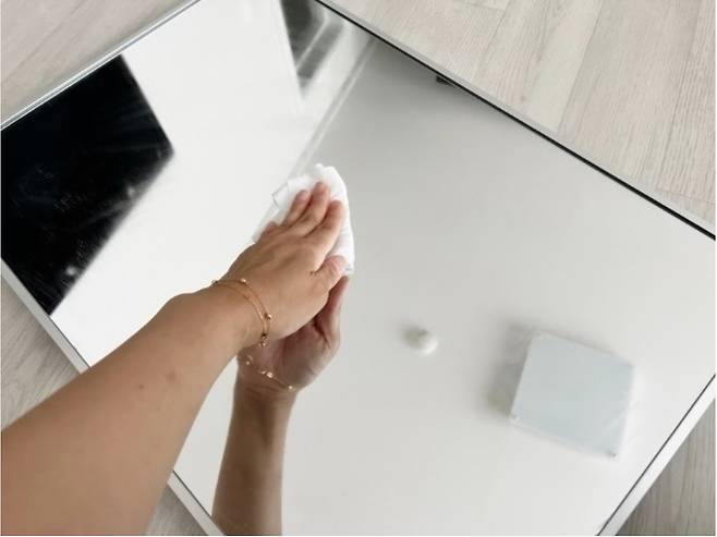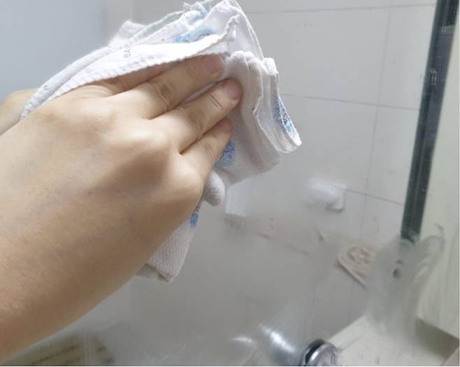 마른천에 린스를 짜서 거울을 골고루 닦아주세요