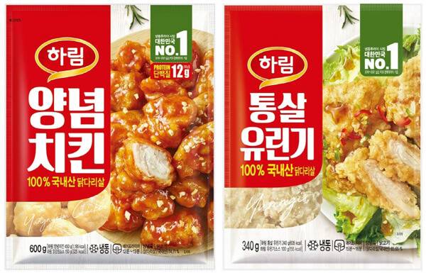 하림은 100% 국내산 닭다리살을 사용했으며, 특제 양념 소스가 들어있어 간편하게 조리할 수 있는 ‘국내산 닭다리살로 만든 양념치킨’과 ‘통살 유린기’를 출시했다. 양념치킨은 닭다리살에 알맞게 밑간이 돼 있어, 튀긴 다음 그냥 먹어도 바삭하고 맛있게 즐길 수 있다. 유린기는 튀김옷에 찹쌀가루와 감자 전분을 넣어, 유린기 특유의 바삭하면서도 쫀득한 식감을 살렸다. 양념치킨은 12,000원, 유린기는 7,980원이다.