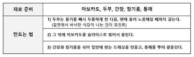 두부는 칼로리가 낮으면서 높은 단백질 함량을 갖춘 식재료다. 여기에 아보카도를 더해 식물성 불포화 지방을 추가한다. 맛이 다소 심심할 수 있으니 간장과 참기름을 소스처럼 사용할 수 있다. 아보카도 대신 가지를 구워서 사용하거나 파프리카를 써서 아삭한 식감을 더해줘도 좋다.