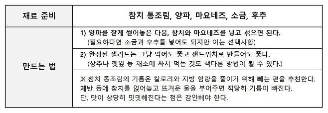 자취생과 같은 1인 가구에게 있어 이것만큼 간단하면서도 건강한 식단을 찾기도 드물 것이다. 참치와 양파, 그리고 마요네즈만 있으면 뚝딱 만들어낼 수 있기 때문이다. 특히 참치 통조림은 풍부한 단백질과 오메가3 지방산의 공급원이며, 보관도 편해 많은 1인 가구가 선호하는 식재료다.