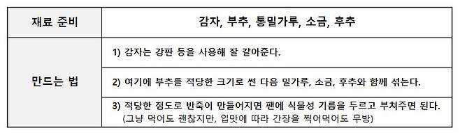 감자는 비타민 C와 섬유질을 제공하는 우수한 식재료다. 전분이 포함돼 있어 복합 탄수화물도 함께 얻을 수 있다. 한편, 부추에는 비타민 A, C, K와 함께 칼슘, 마그네슘, 철분 등 무기질, 그리고 섬유질과 항산화 성분까지 골고루 들어있다. 칼로리가 낮으므로 다이어트 식단 추천 시 꽤 자주 등장하는 식재료이기도 하다.